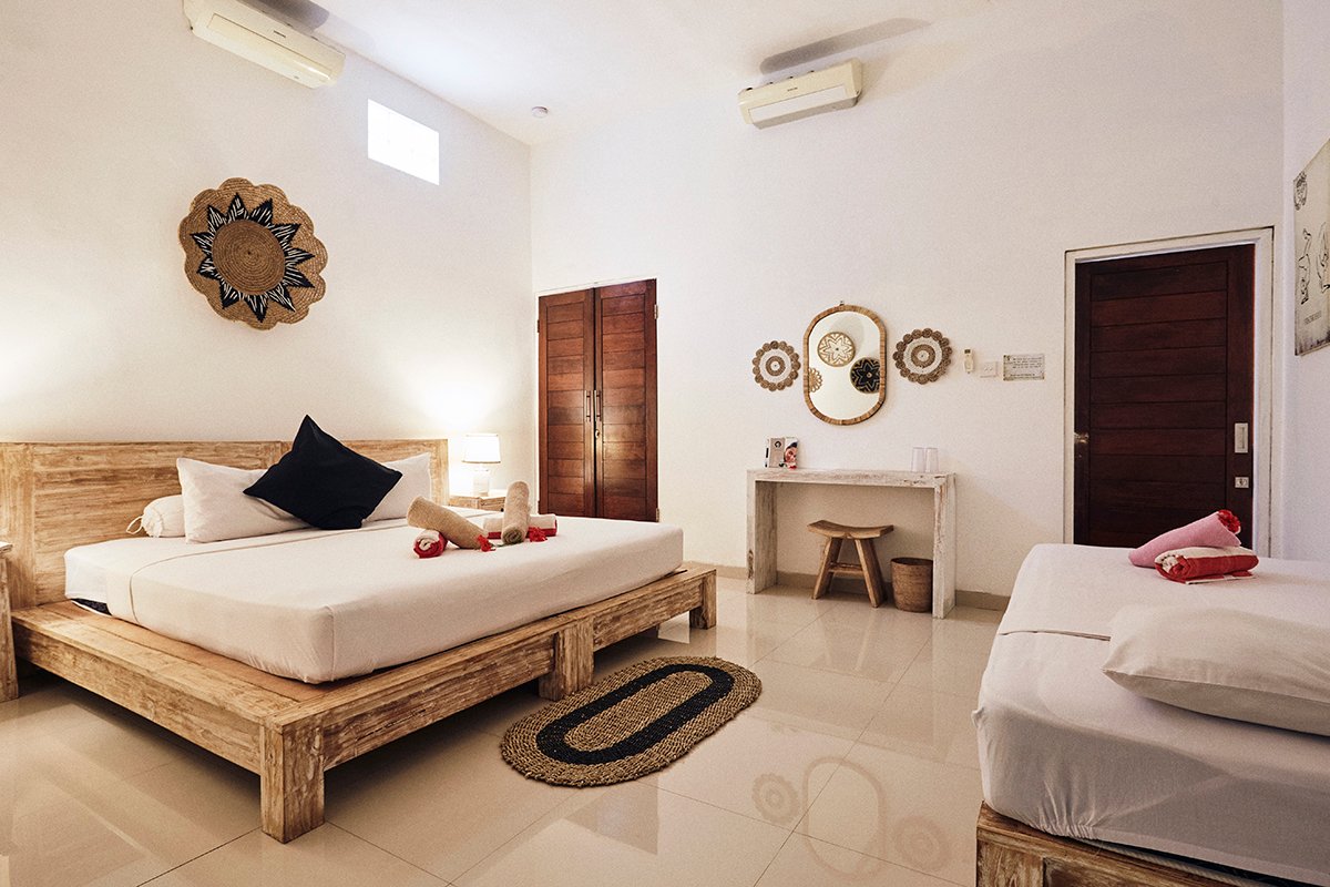 Located in the main house, this air-conditioned triple room has a shared terrace and an en suite open bathroom. The twin beds can be rearranged into double bed.